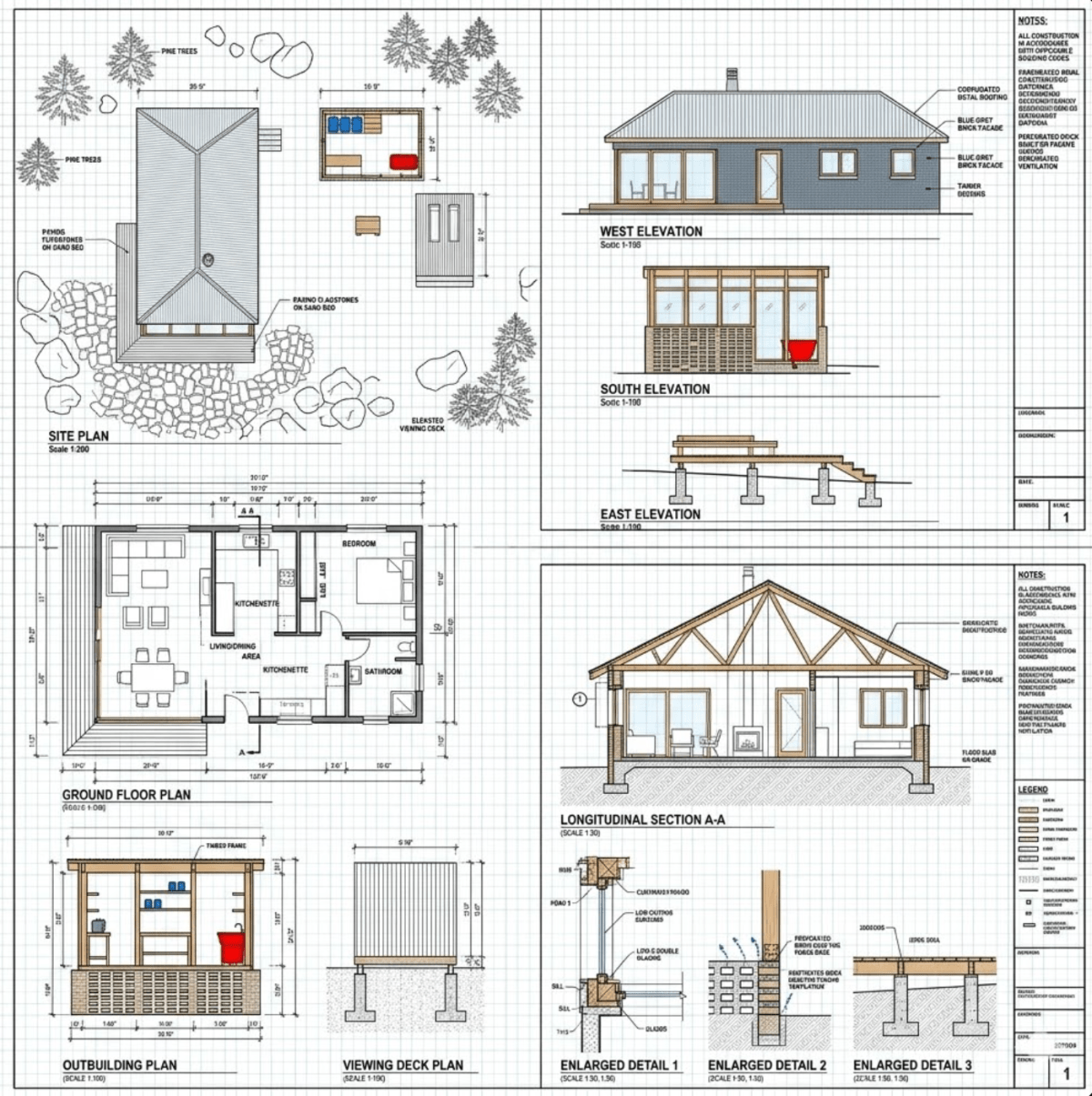 The ground floor plan organises all essential living functions efficiently: a main living area, kitchen, and bathroom within a compact form, with a covered outbuilding adjacent for storage or utility use. A separate viewing deck extends from the site, elevated to capture long views across the landscape — a simple addition that transforms the property’s relationship to its setting.