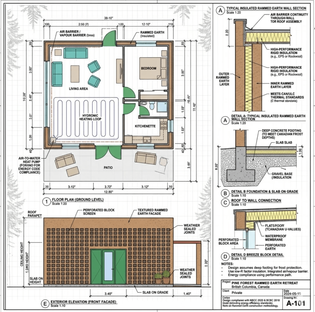 The construction documentation is thorough, detailing a deep concrete footing with gravel base preparation, reinforced concrete slab, and carefully designed roof-to-wall connections that protect the rammed earth structure from moisture over the long term. Every detail has been resolved with an eye toward longevity — this is a home built to outlast its builders.